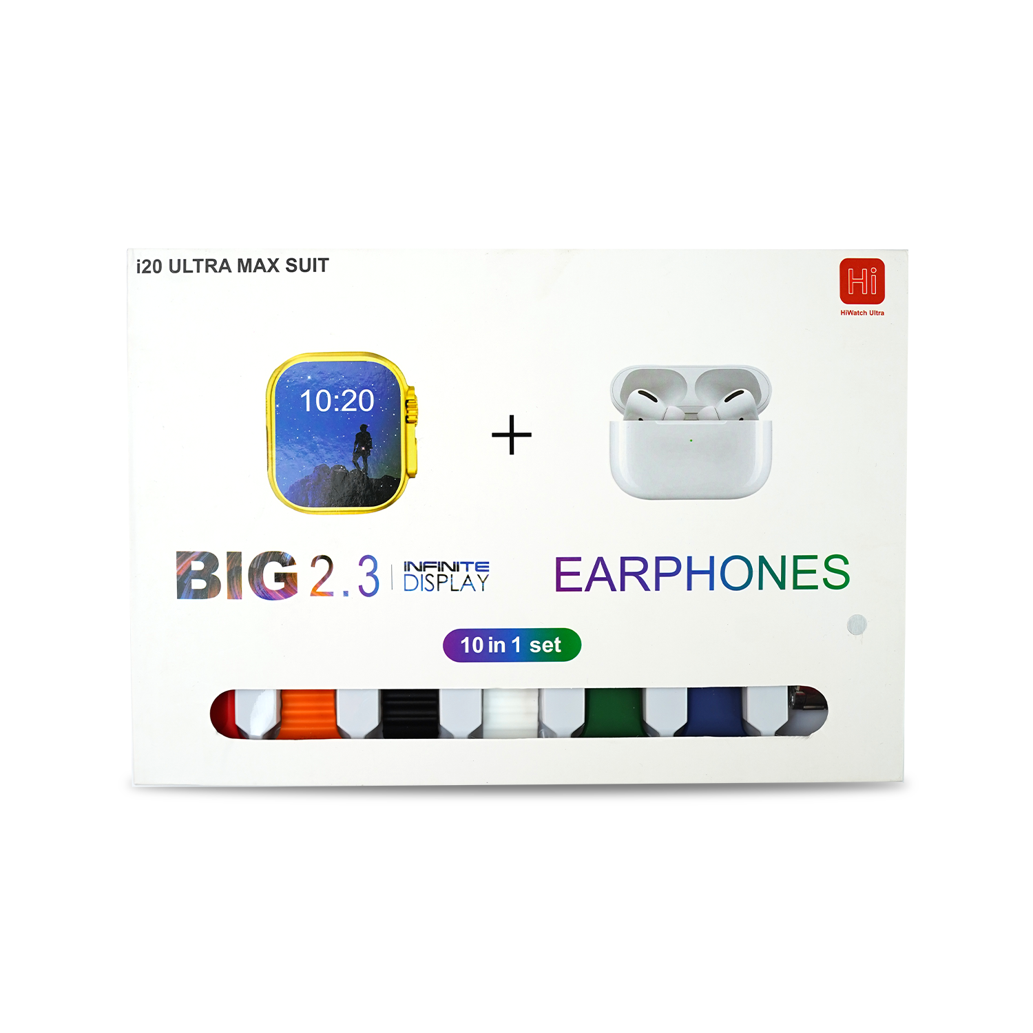 I20 Ultra Max Suit – BIG 2.3" Display Smart Watch + Wireless Earphones | 10-in-1 Strap Set